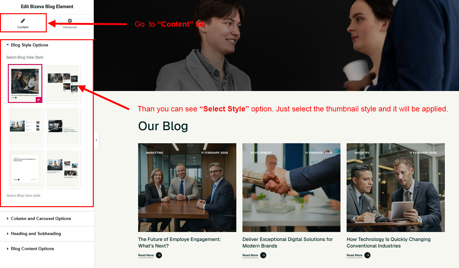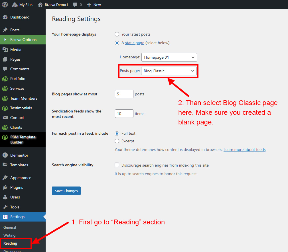 We created a Blog Element in Elementor Page Builder which you can use to show post on any page you want. Just drag and drop the Bizeva Blog Element on any page and the post list will appear.