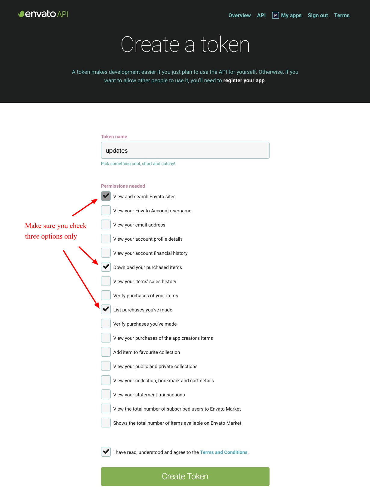 If you’re already logged into your Envato account you’ll be token to the screen below (otherwise you will be prompted to login first before being redirected to this page). On this screen you can see what the Envato Market plugin is requesting permission to access via your Envato account (Envato sites, the ability to download your items, a list of your purchases and verification of your purchases). To proceed give your token a name, check the box that you have read and agree to the terms and then click the green button to create your token.
