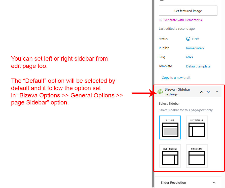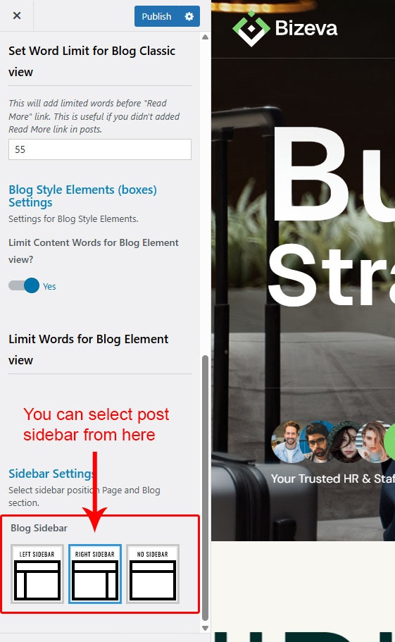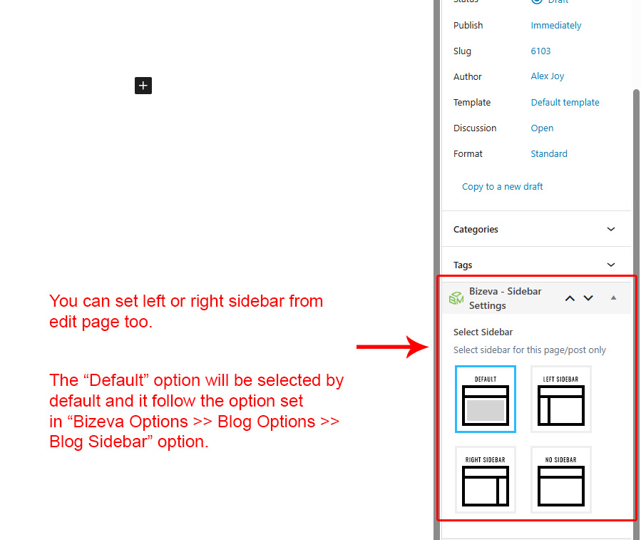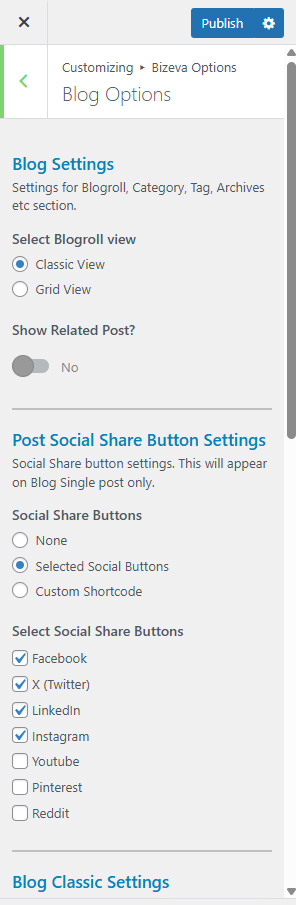 This is specially created sidebar postion (either left or right as selected in Bizeva Options section) that will be shown as sidebar widget on Blog pages like blog list view, single post view, blog category view etc.