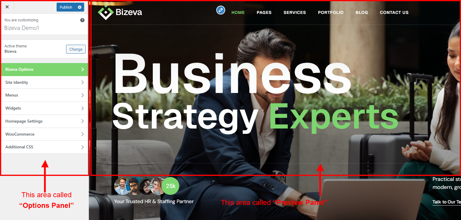 After clicking on the Bizeva Options panel you will redirected to the Customize section. It has two sections. Left area called "Options Panel" and the right area called "Preview panel". See screenshot given below: