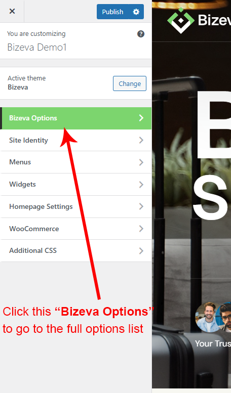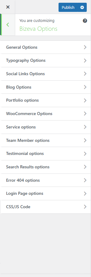 Bizeva Options (Theme Options) panel is created with WordPress' Customize section. We added our own options with WordPress' default options.