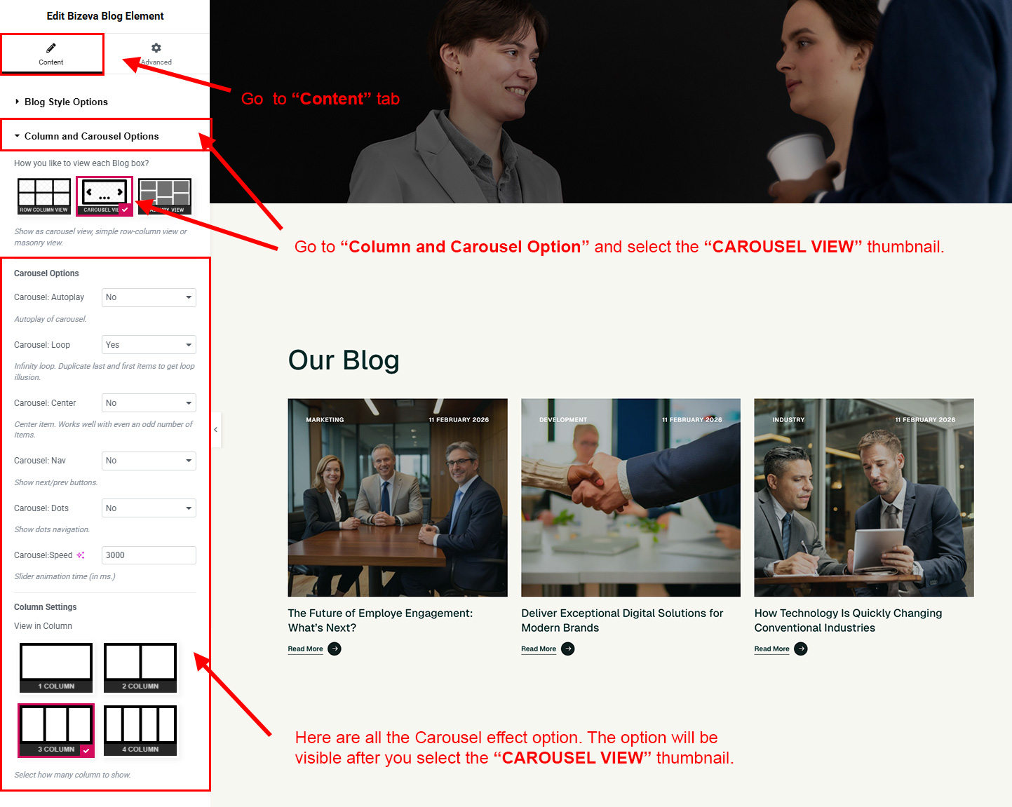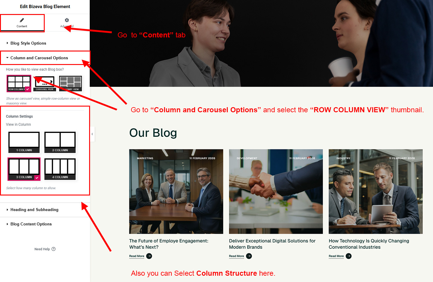 But you can change the view easily. Just go to Bizeva Options >> Blog Options and you will find all options to modify the view. You can convert it to block view, column view, limit the blog intro text etc.