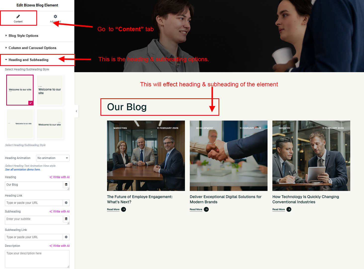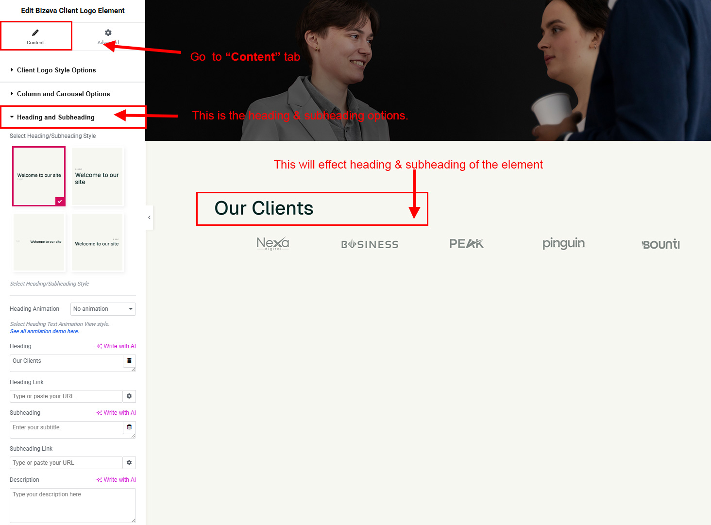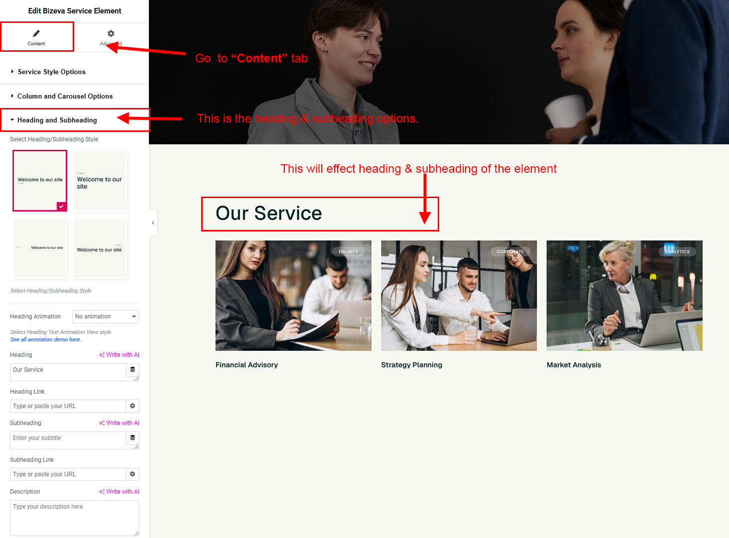 The heading and subheading will appear at top of the element. You can change text, add link to the heading or subheading, change alignment, change tag (for SEO purpose) etc.