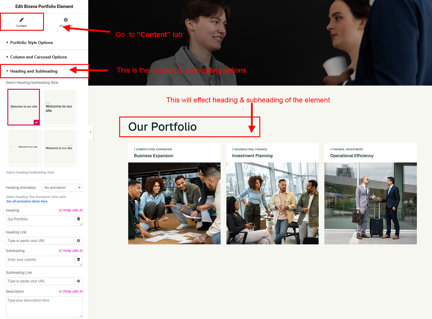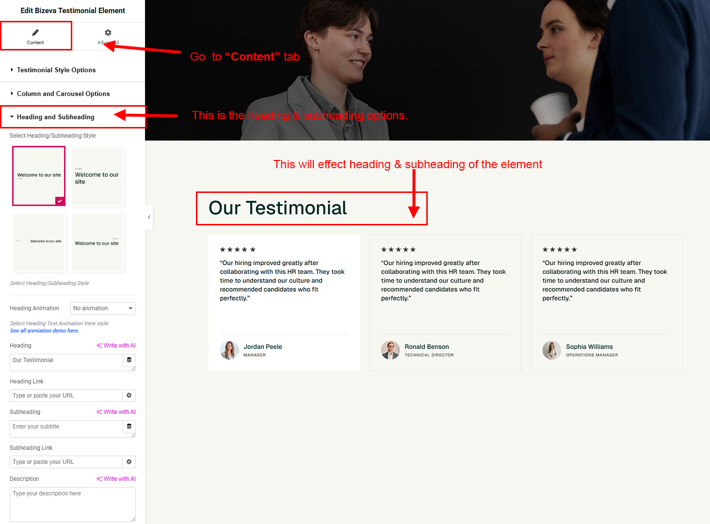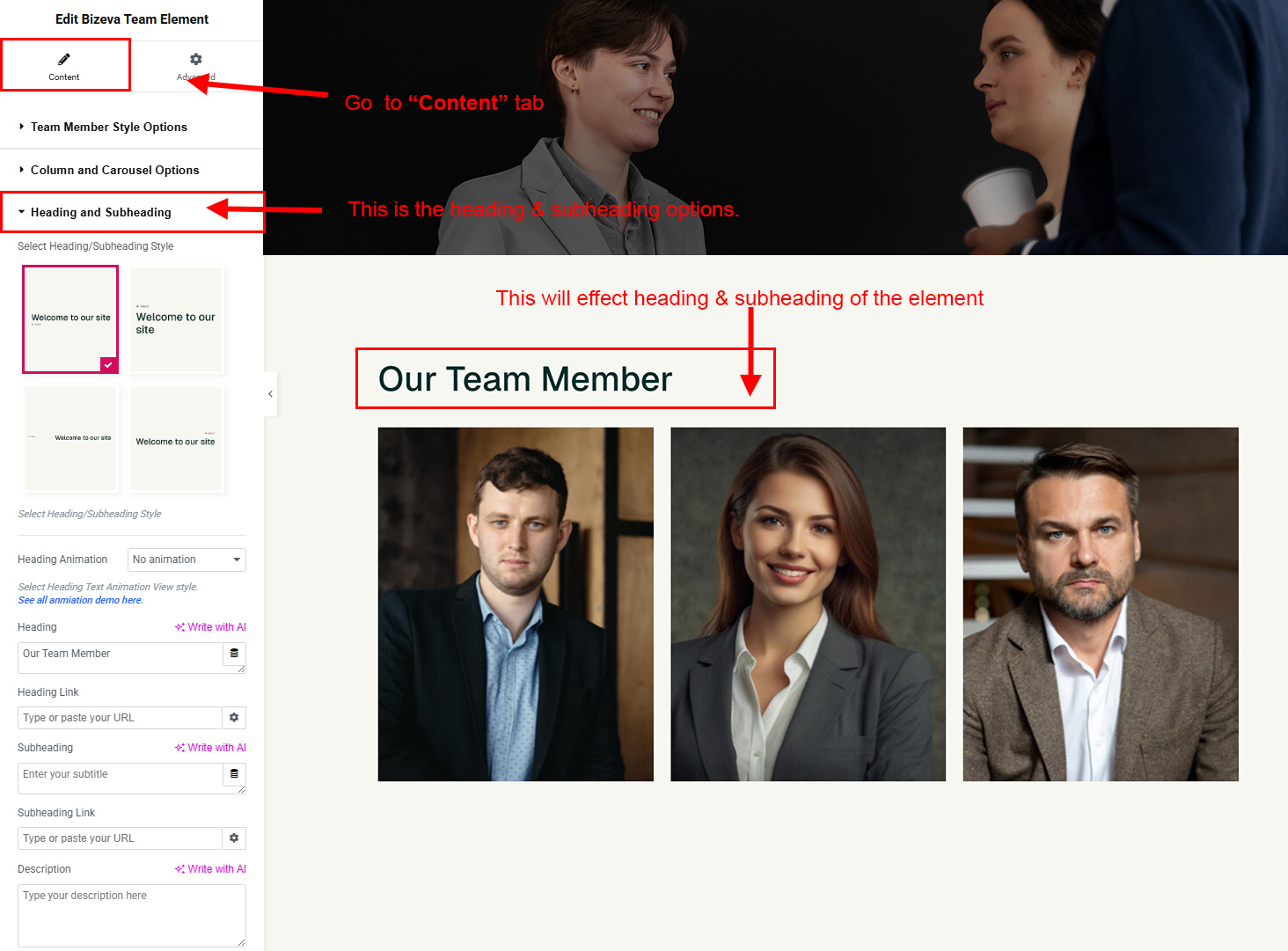 The heading and subheading will appear at top of the element. You can change text, add link to the heading or subheading, change alignment, change tag (for SEO purpose) etc.