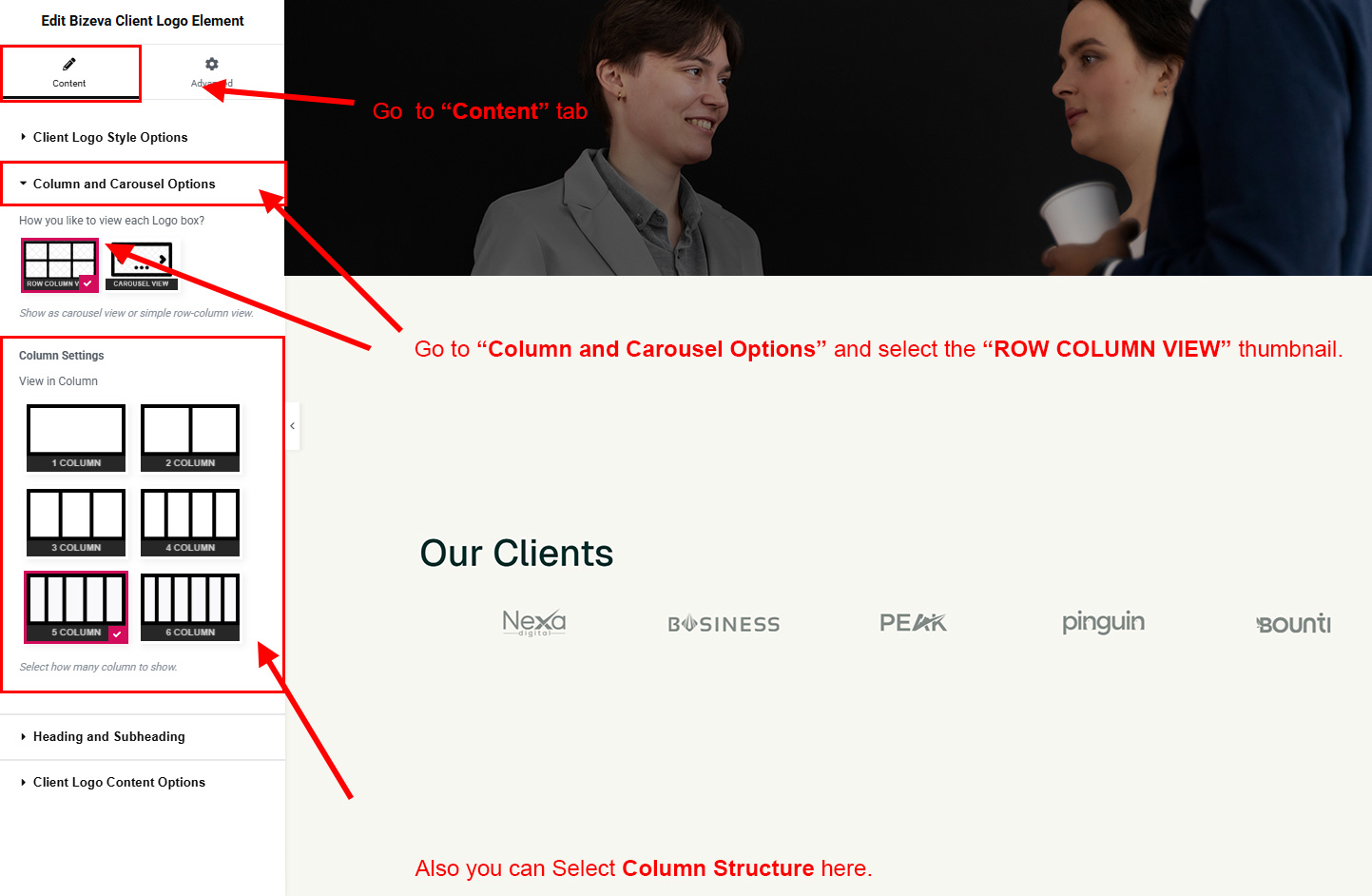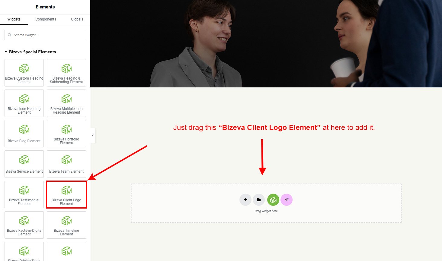 Now we have some Client Logo posts. So we can show all Client Logo on a page. Create a new page and add Bizeva Client Logo Element on a page by dragging it.