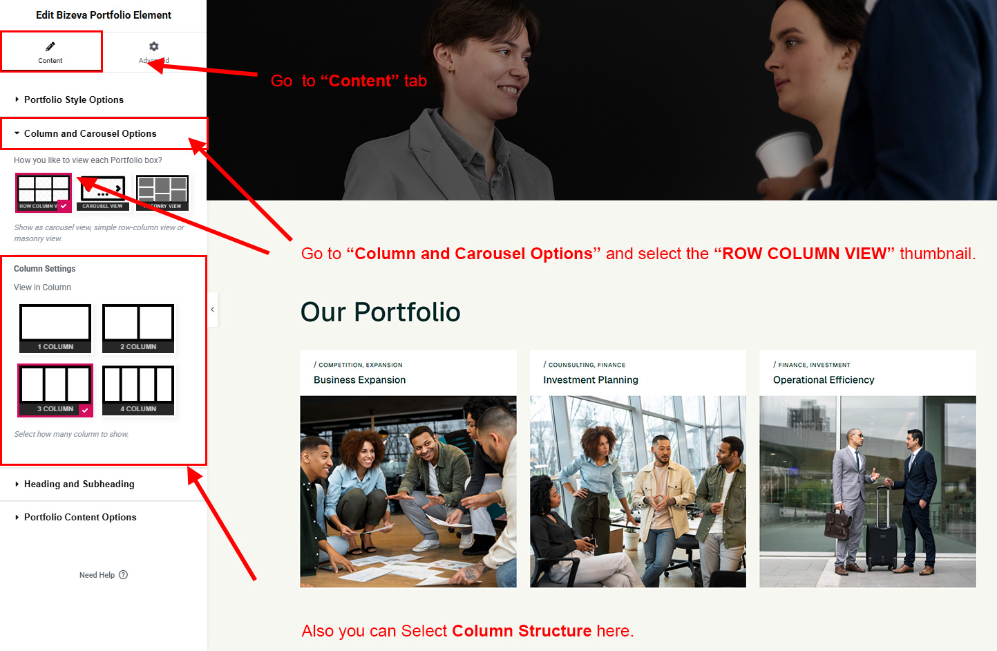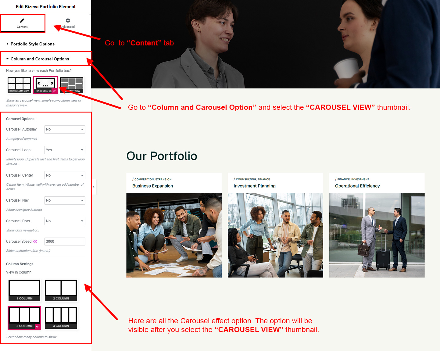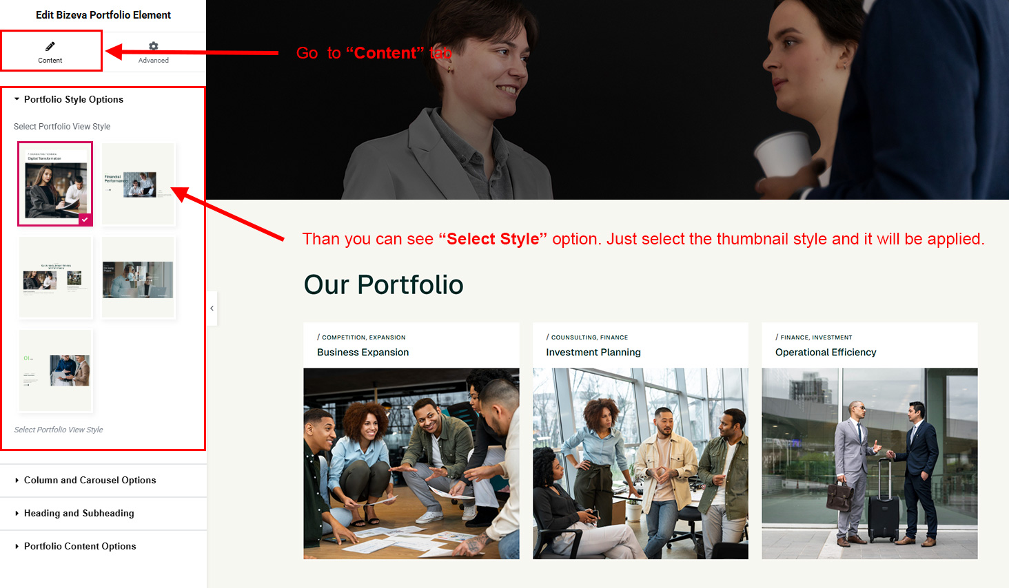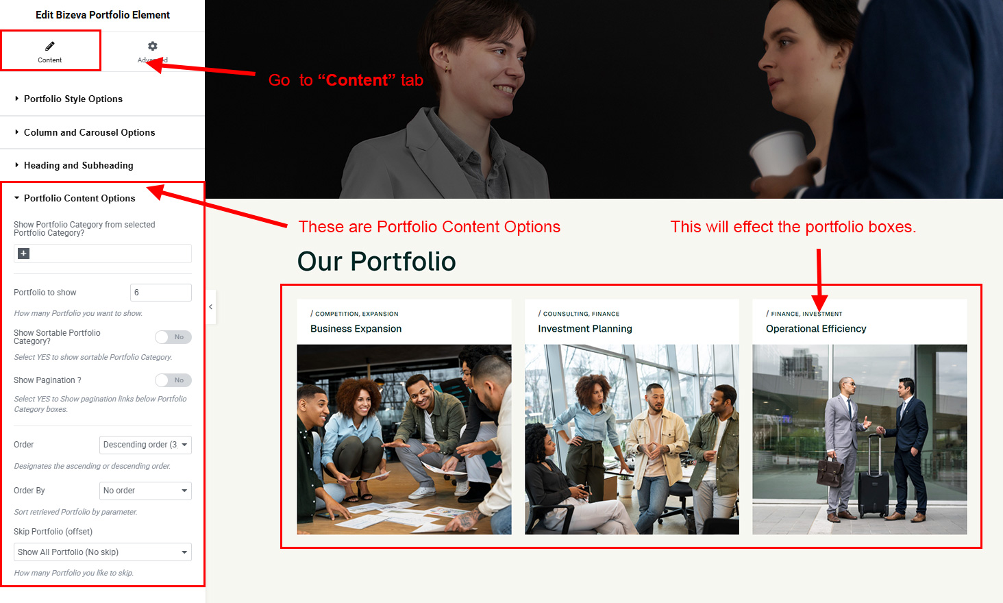 Now we have some Portfolio posts. So we can show all Portfolio on a page. Create a new page and add Bizeva Portfolio Element on a page by dragging it.