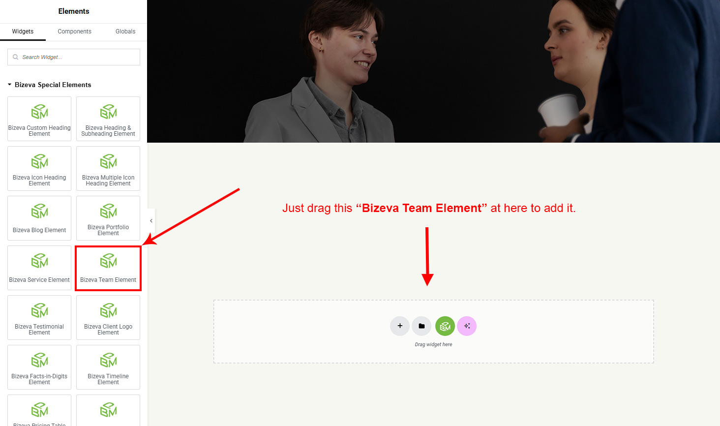 Now we have some Team posts. So we can show all Team on a page. Create a new page and add Bizeva Team Member Element on a page by dragging it.