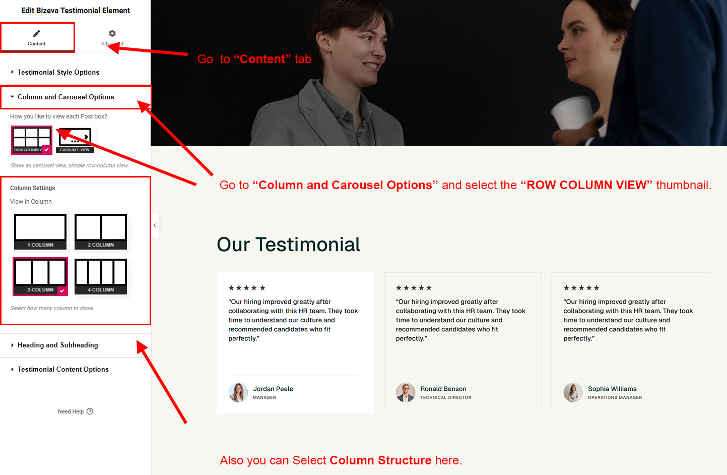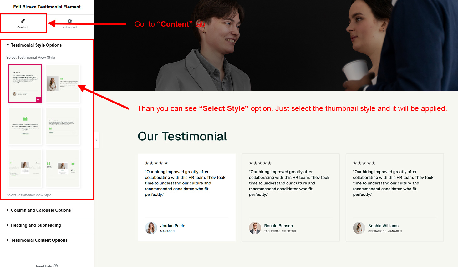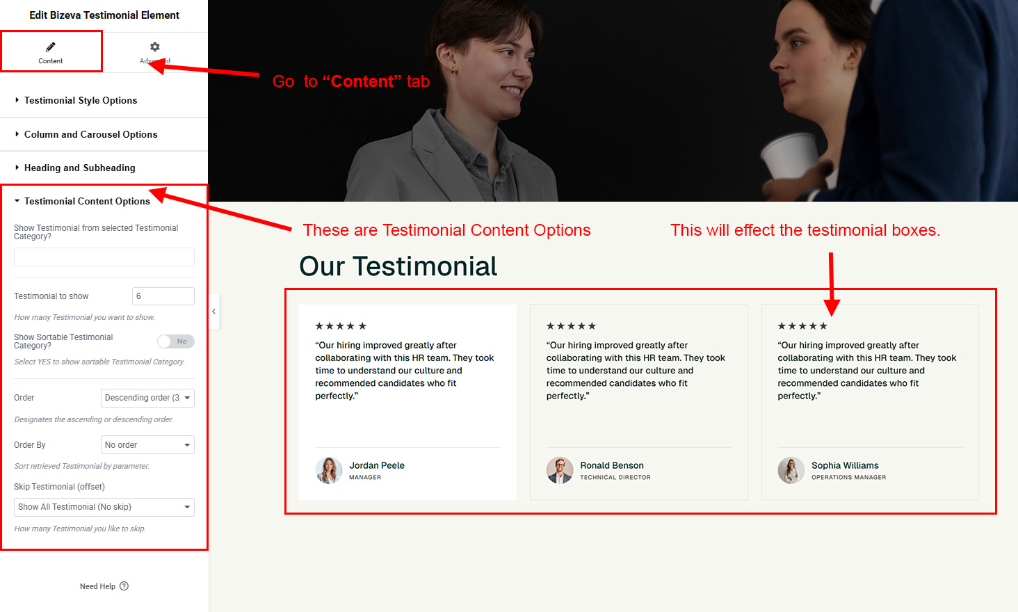 You can select the testimonial options here. Like how many testimonial you like to show, show testimonial from selected group (category), testimonial order etc.