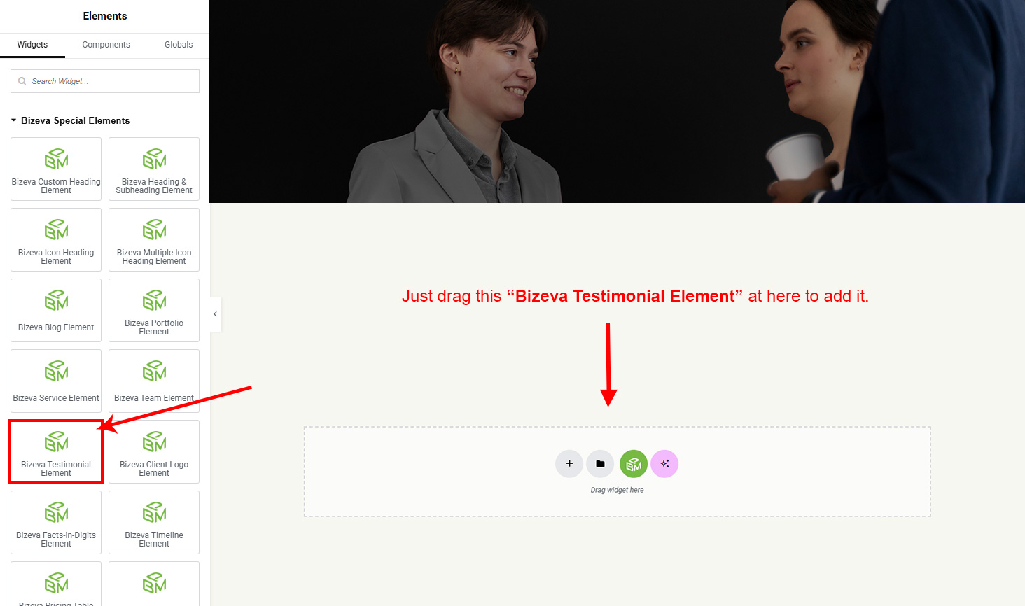 Now we have some Testimonial posts. So we can show all Testimonial on a page. Create a new page and add Bizeva Testimonial Element on a page by dragging it.