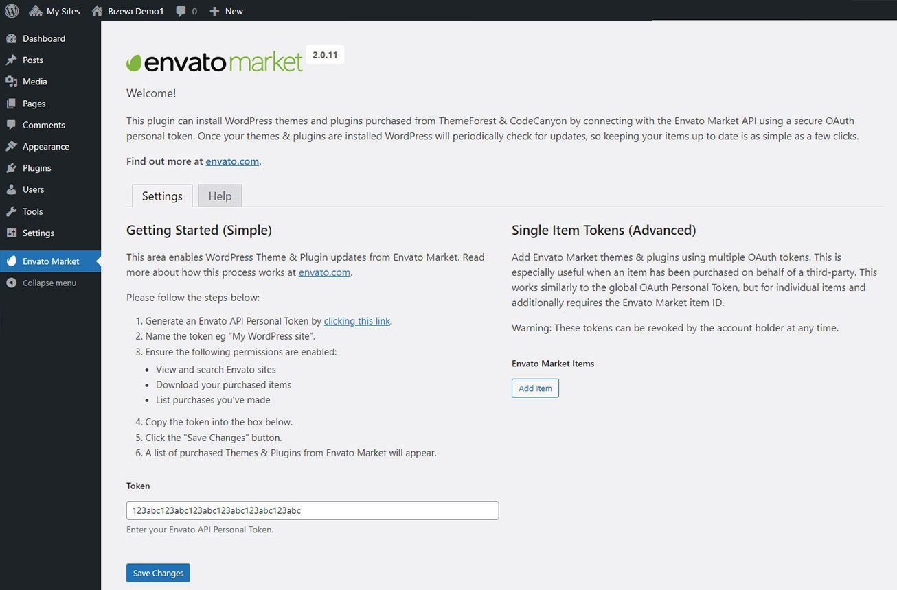 Now go back to your WordPress installation and paste in your Envato API token then click save.
