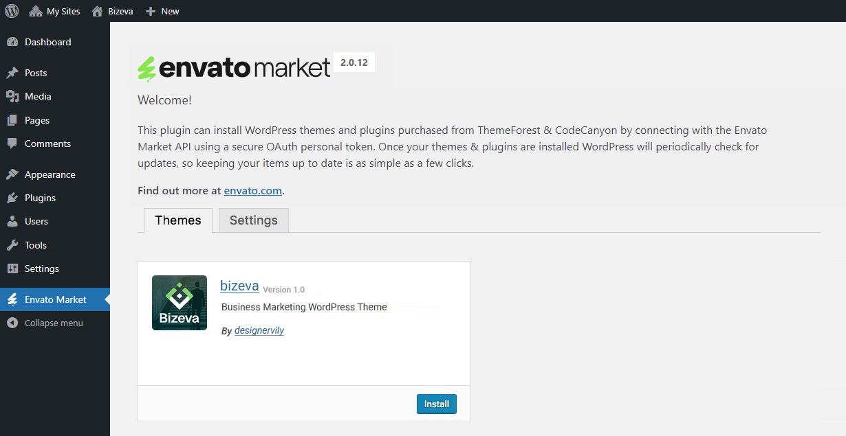 Once your token is saved and validated your page will refresh to show your Envato Market landing page with added tabs for your items. The added tab(s) display all of your theme and plugin purchases as well as their version numbers and quick links to the theme and author pages. So now you can install theme and also update theme in just one click.