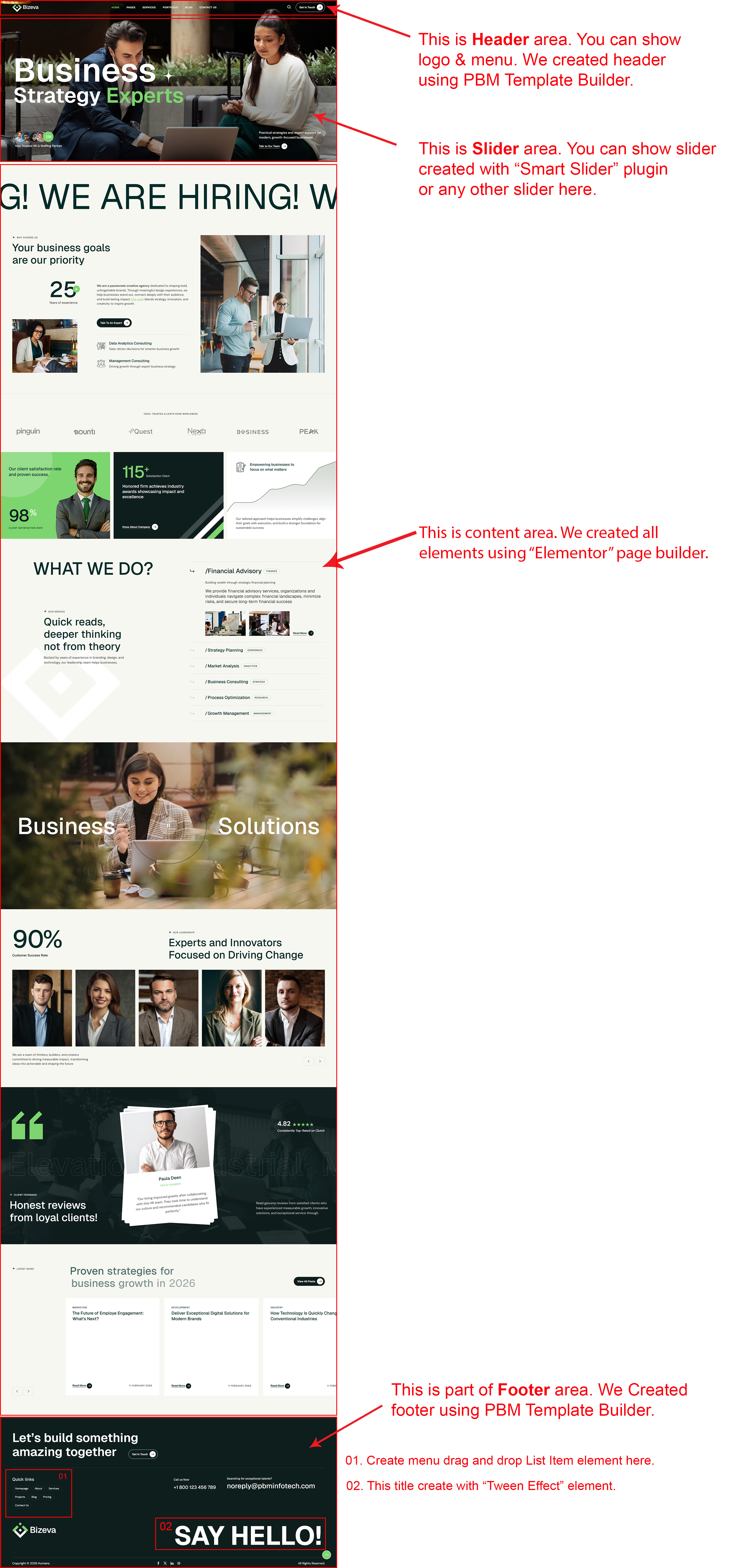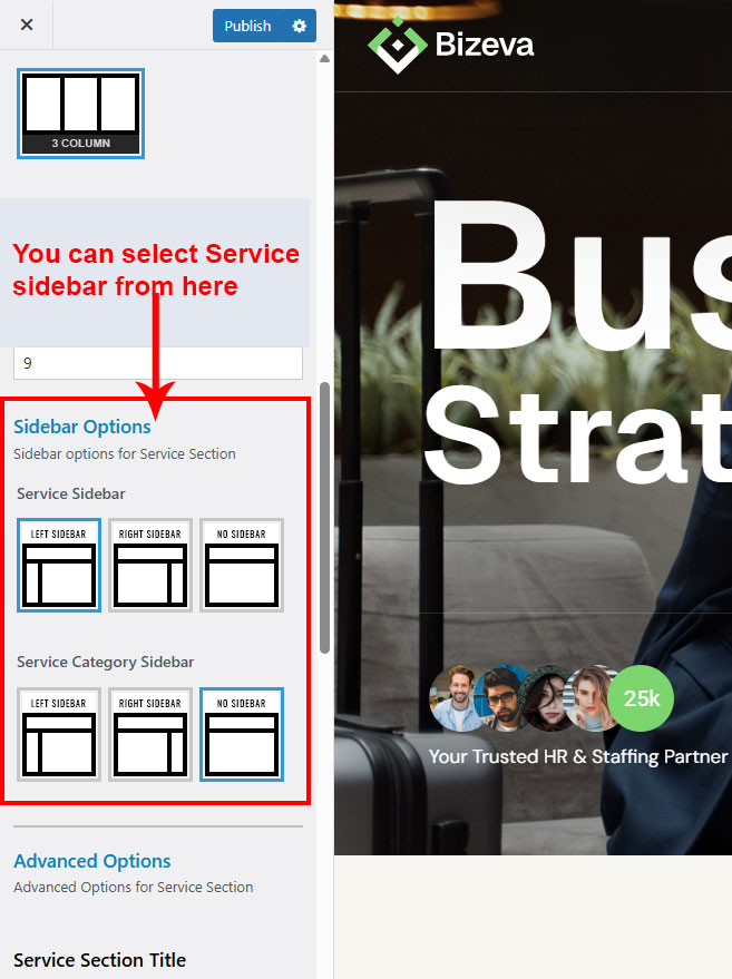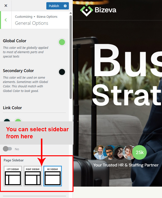 There are different sections in Bizeva theme. Here you will find name of each section name so you can find their options easily. You can customize each sections from Bizeva Options easily.