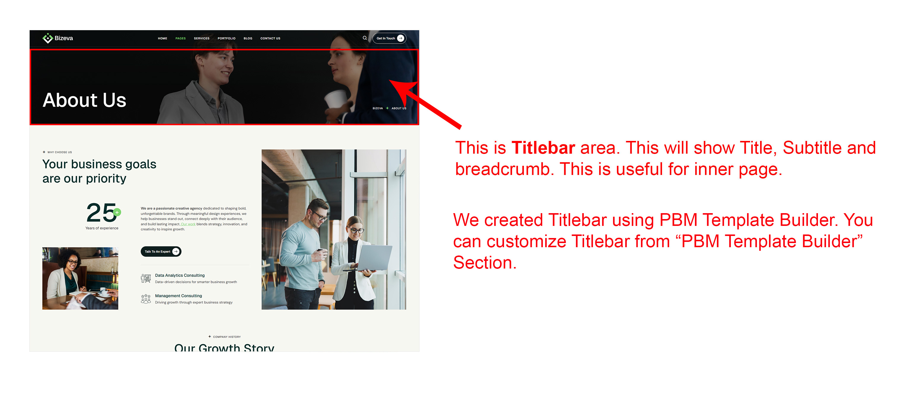Titlebar will appear below header and slider. This will show page title, sub-title and breadcrumb.