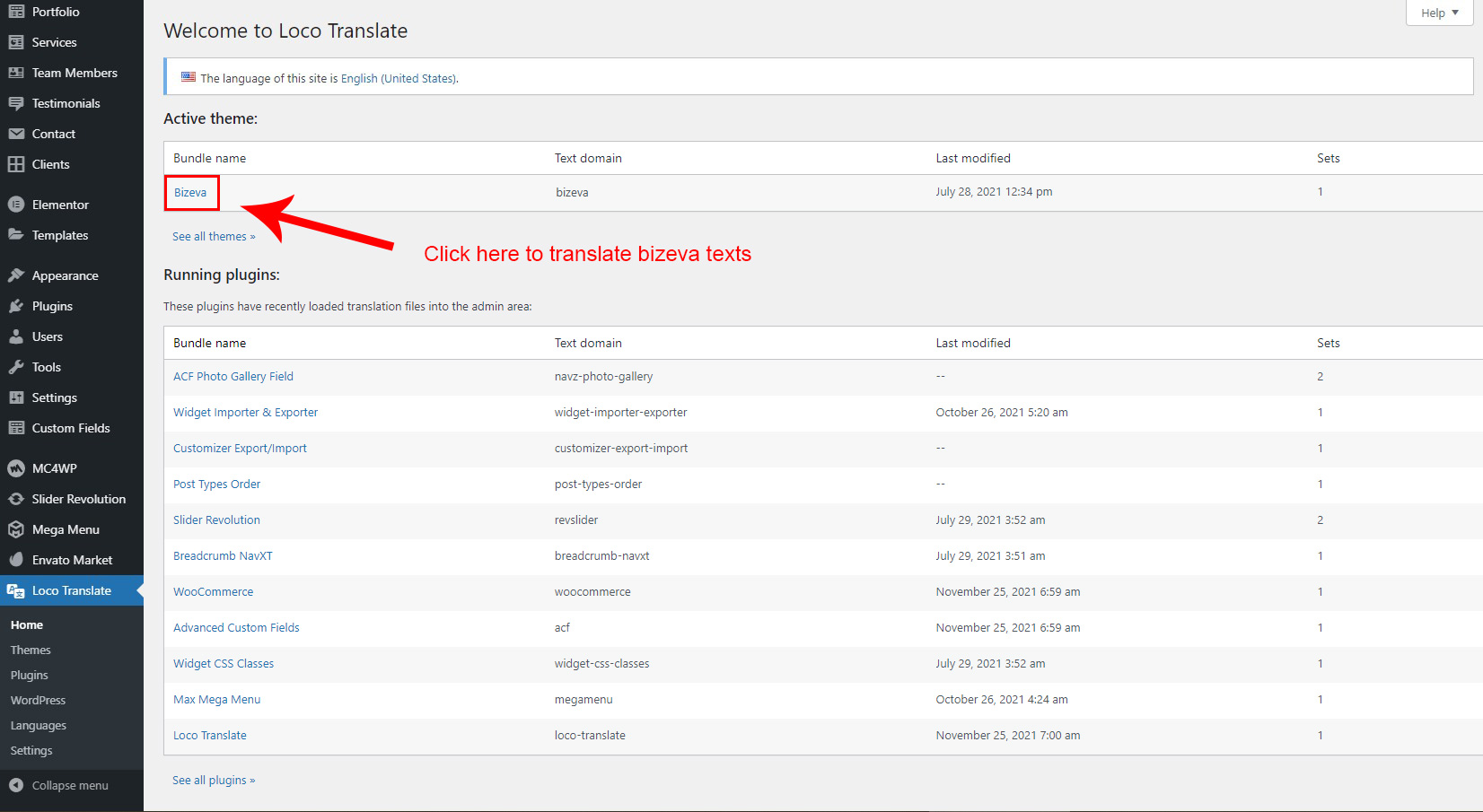 3. Now go to Loco Translate section and click on Bizeva theme.