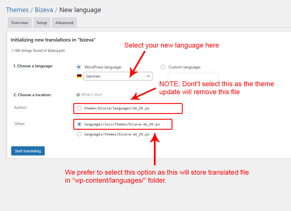 5. Now select the new language. Also make sure you select the last option (the languages/themes/file.po option) so it will store file in "wp-content" folder.