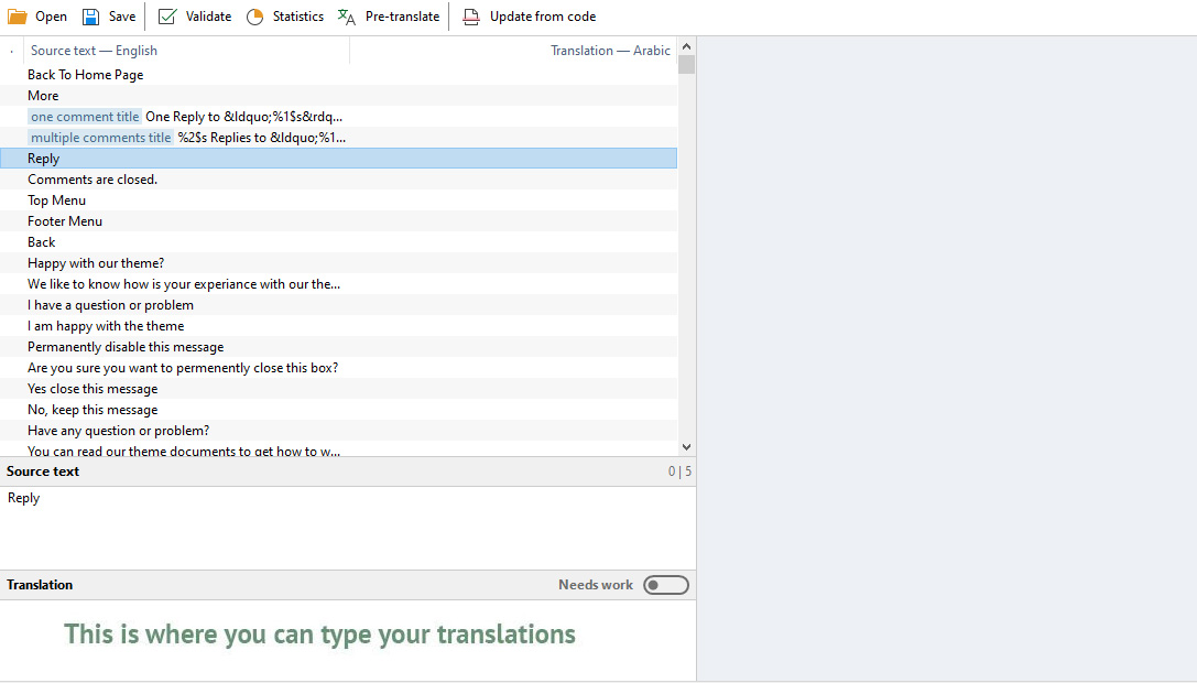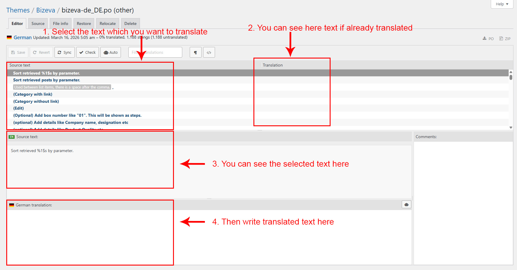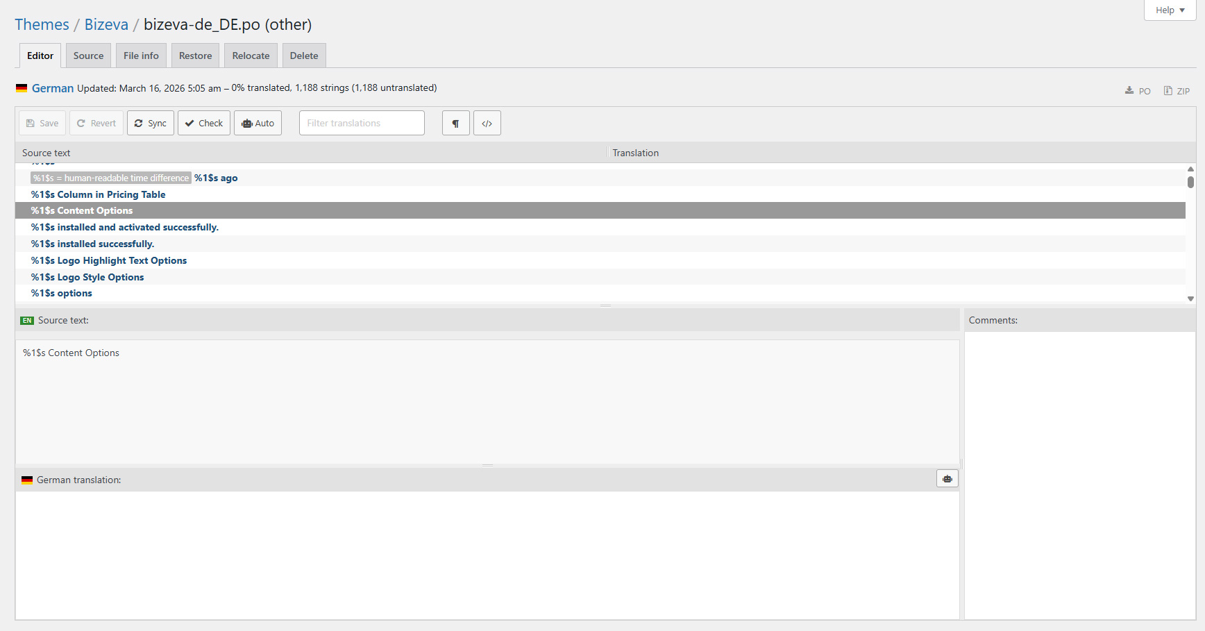 When you are done translating all the needed text strings into your desired language, save the file in /wp-content/languages/themes/ folder with language code in name. For example, if you were translating to the Deutsch language, you would save it as bizeva-de_DE.po. The corresponding bizeva-de_DE.mo file will be auto created by POEdit software.