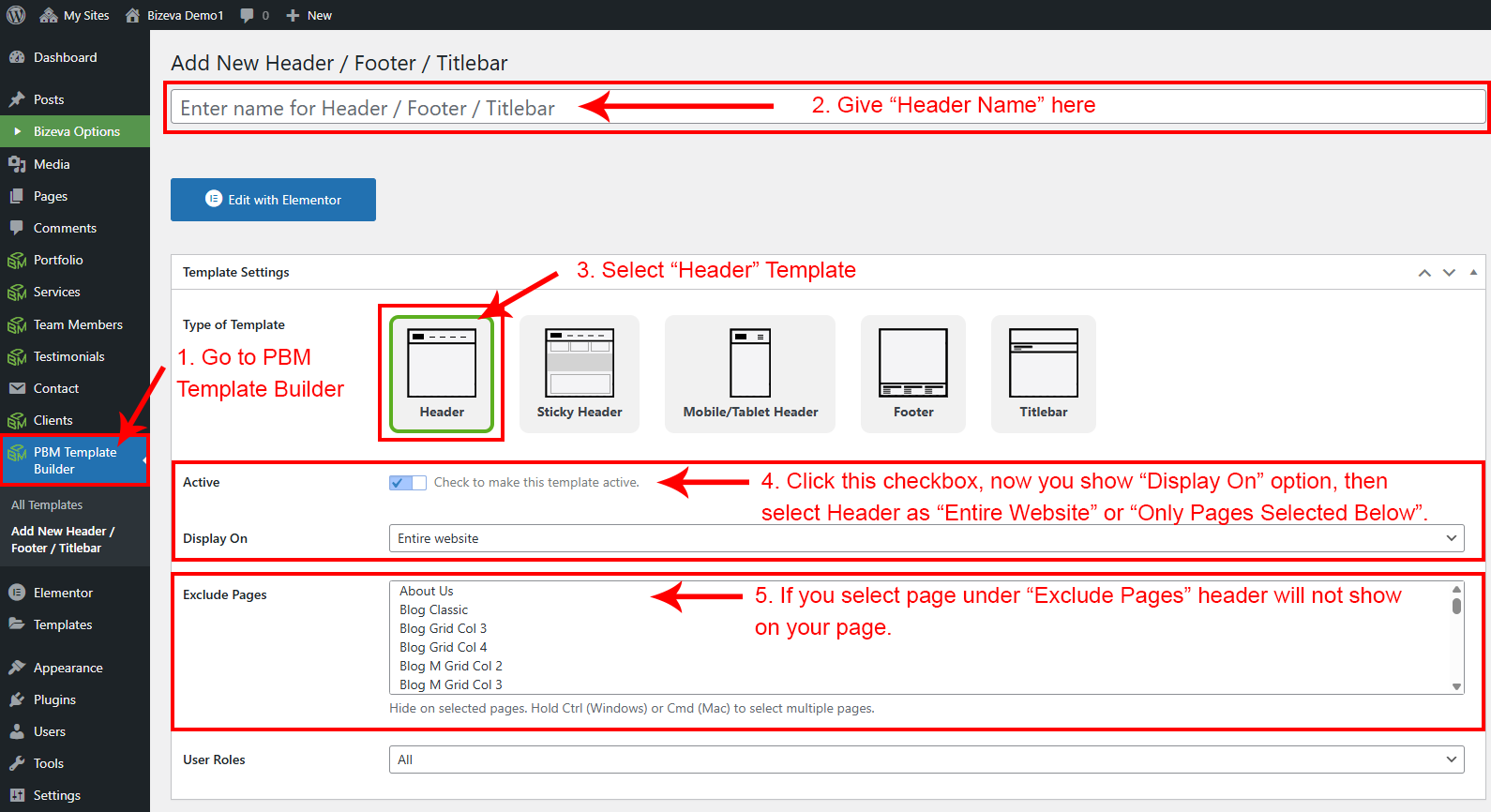Go to the Dashboard, open PBM Template Builder, click Add New under Header/Footer/Titlebar, name your template (e.g., Header Style 1), select "Header" as the type, and click "Publish" on the right to create your header.