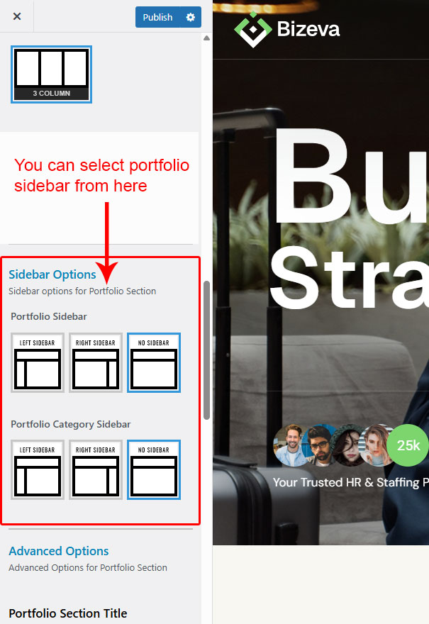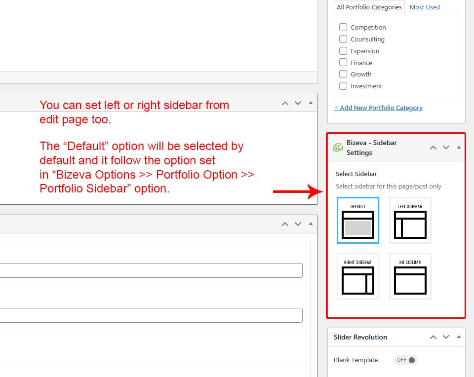 This is specially created sidebar postion for Portfolio Category view only. You can select sidebar view (left or right) in Bizeva Options >> Portfolio Options section. Also you can show Portfolio Category without sidebar too.
