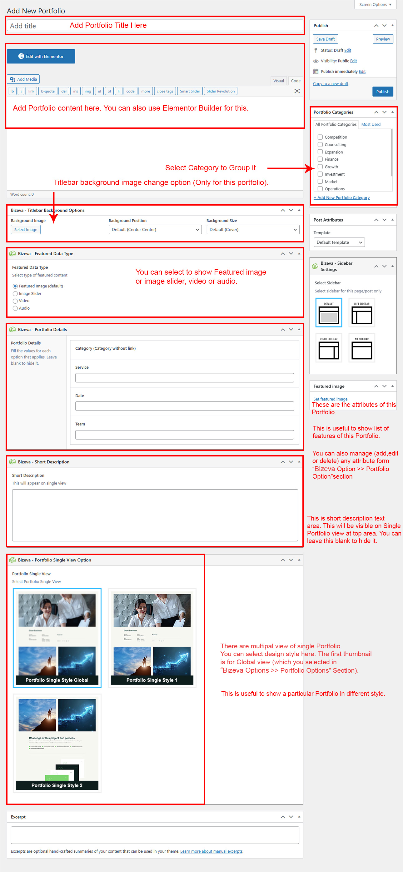 If you already done demo content setup than you can edit existing portfolio and check how we added data so you can understand each option perfectly.