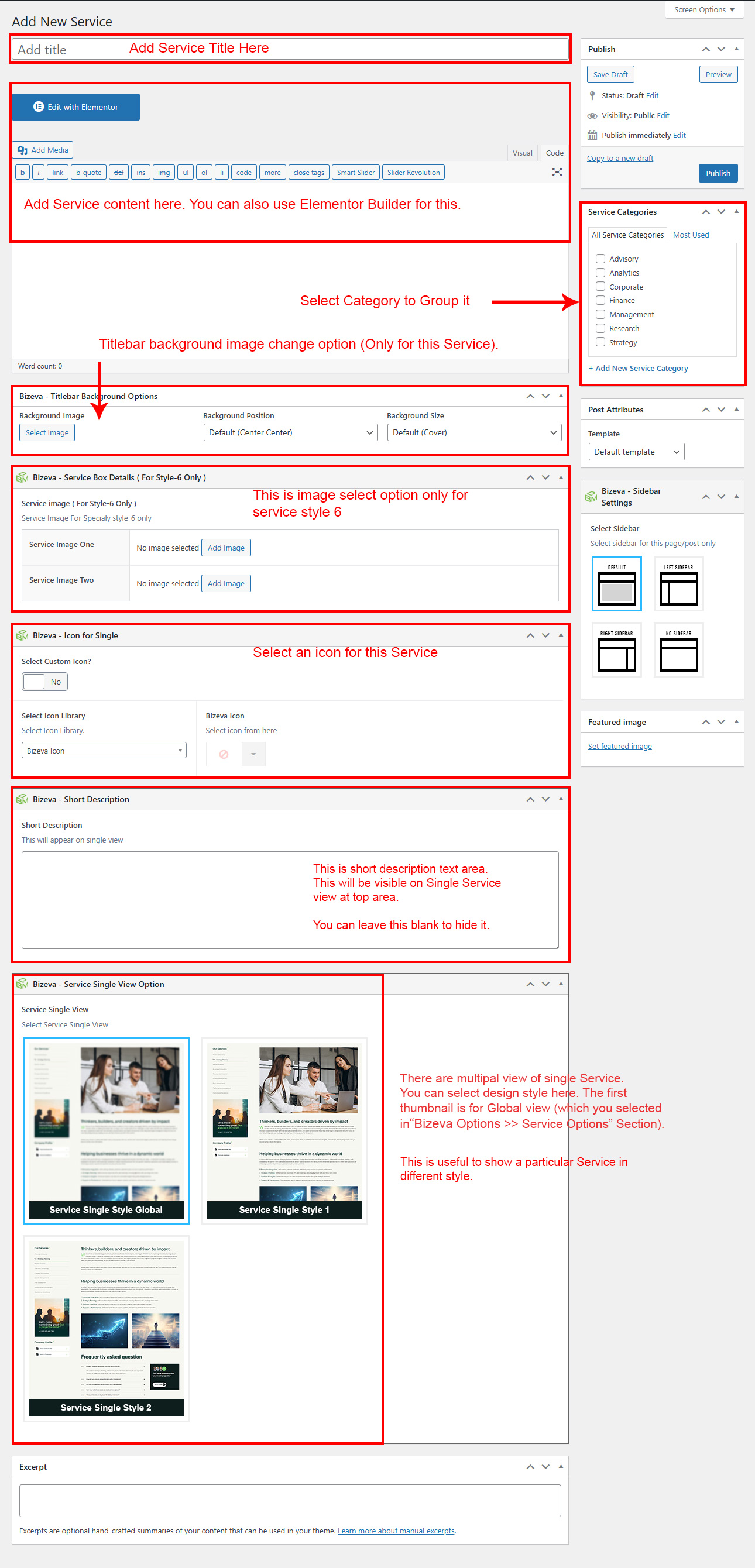 If you already done demo content setup than you can edit existing service and check how we added data so you can understand each option perfectly.