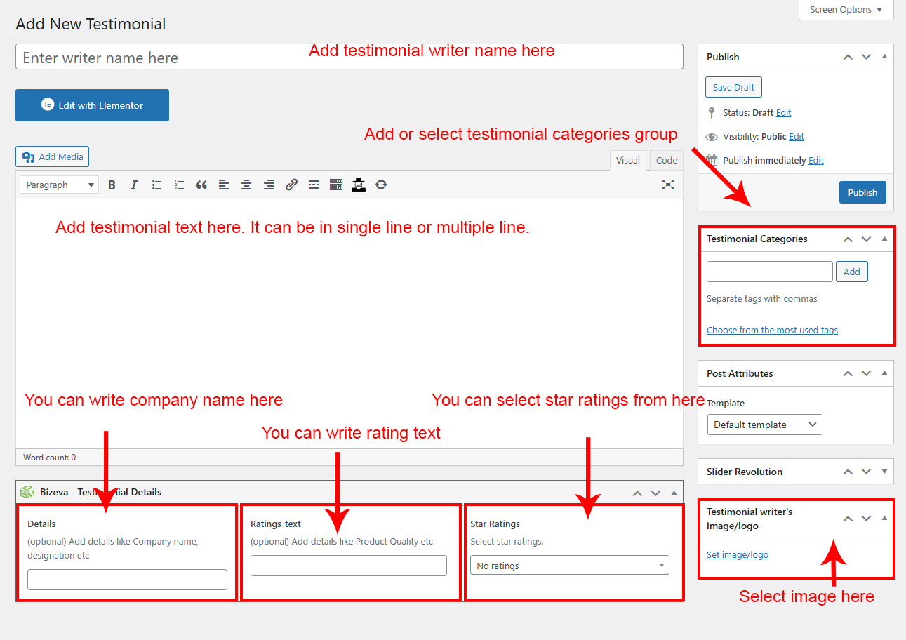 If you already done demo content setup than you can edit existing testimonial and check how we added data so you can understand each option perfectly.