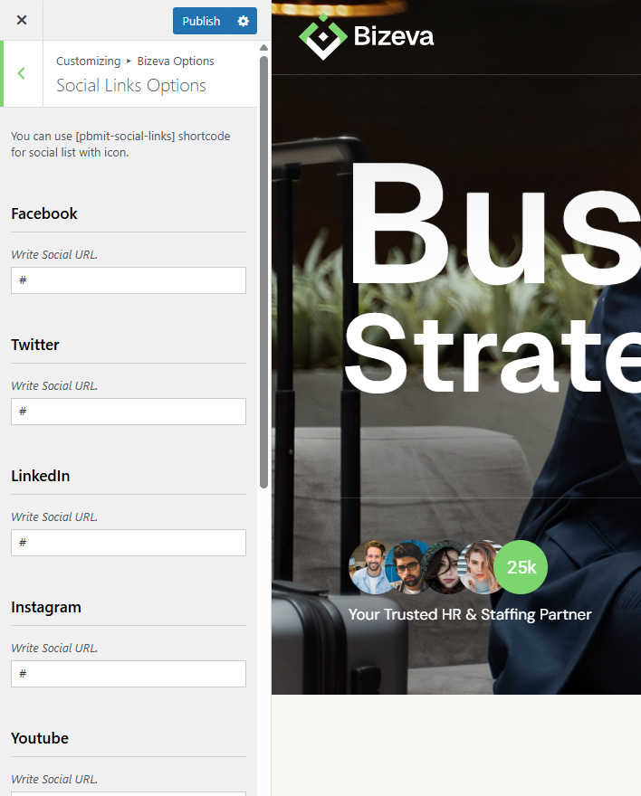 This shortcode specially created to show social links. You can set social links in Bizeva Options >> Social Links Section and write your social links. Than it can be shown using [pbmit-social-links] shortcode.