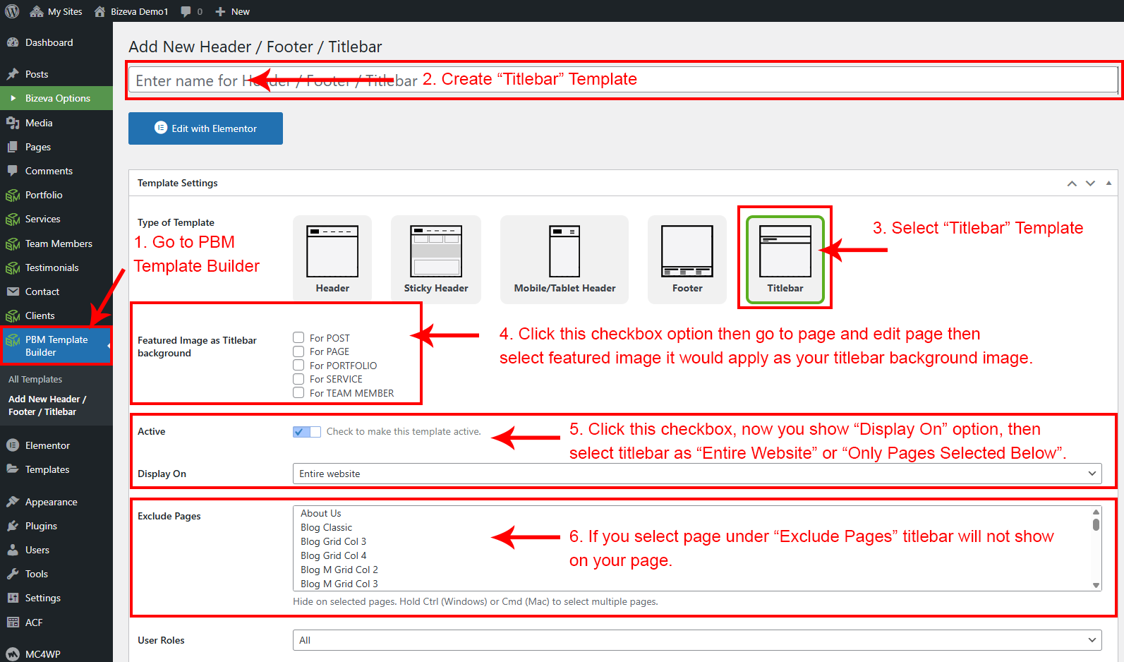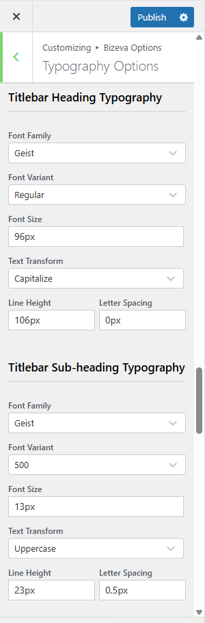 You can see the screensot of the Titlebar Typography Settings ( which appear under Bizeva Options) provided on the right side.