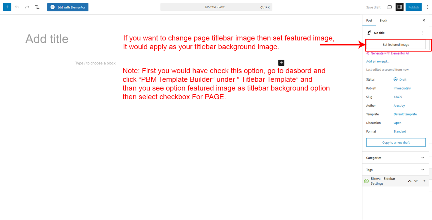 This will override the options set under PBM Template Builder Options > Titlebar page Edit with Elementor > Container > style image. This will help you to set special design the Titlebar on specific page or post.